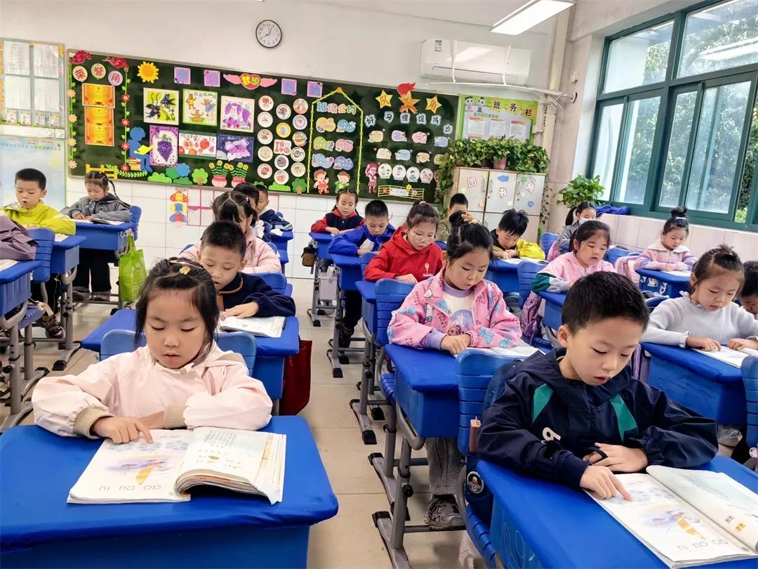 朗朗书声,端正坐姿。珍珠娃们左手摁书,右手指读,字字清晰,句句响亮,在节奏和韵律中,体会语言的温度。